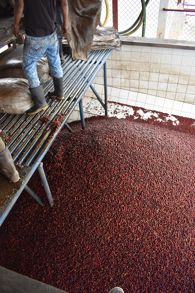 ラス・ヌベス農園で栽培しているチェリーは、非常に鮮やかな赤い色をしています。手摘みによって収穫され、入念に選別したのち、その日のうちにウェットミルに運ばれます。チェリーをパルパーにかけて外皮と果肉を除去し、24時間の発酵処理を行っています。その後パーチメントを洗い、日照時間に合わせて約14日~25日間、パティオの上で乾燥させています。