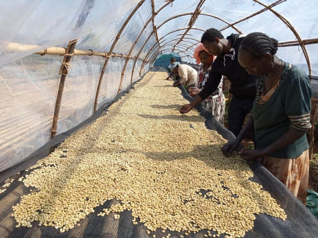 エチオピアで11時から3時が最も日差しが強く、気温が一気に上昇する時間帯には一度広げられたコーヒーはいくつかの区画にまとめて集められ、過度に急激な温度変化による生豆の水分値の減少を抑えられます。そして日差しが弱くなったタイミングで改めて均一にベッドに広げられます。同時に紛れ込んだ発育不良の欠点を人の目と手で丁寧に取り除かれていきます。